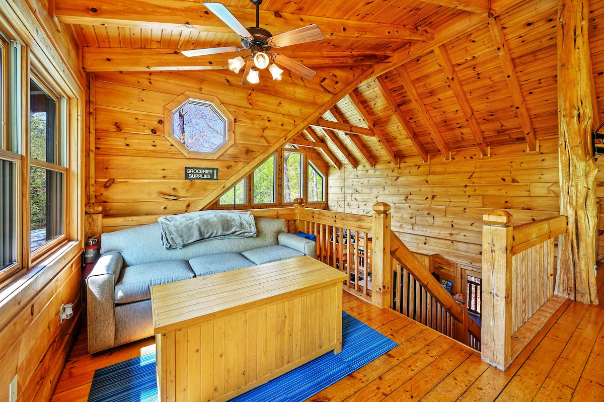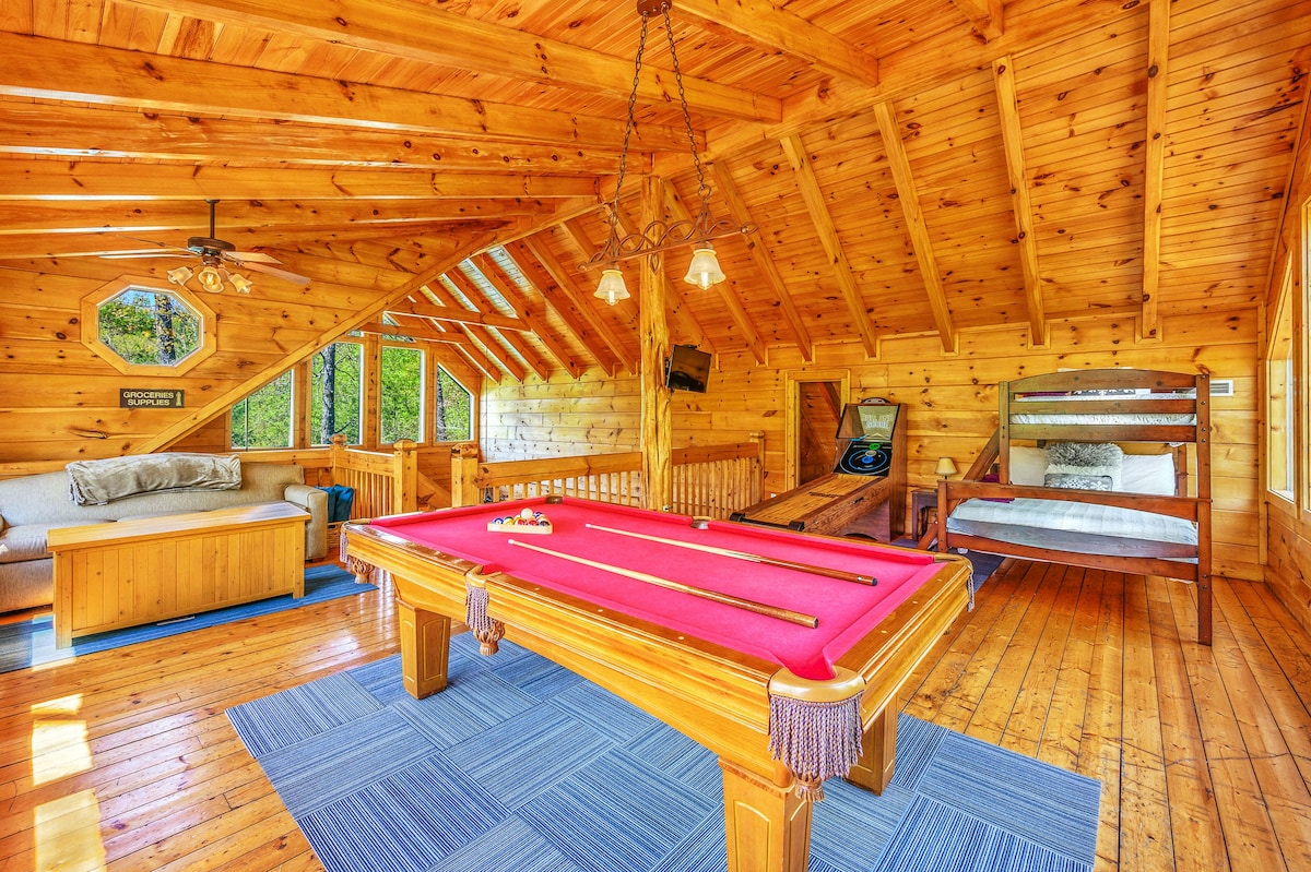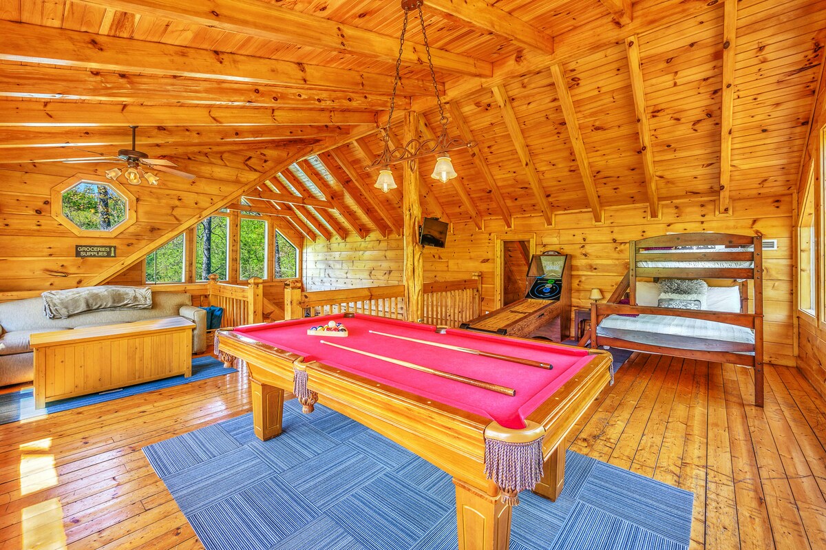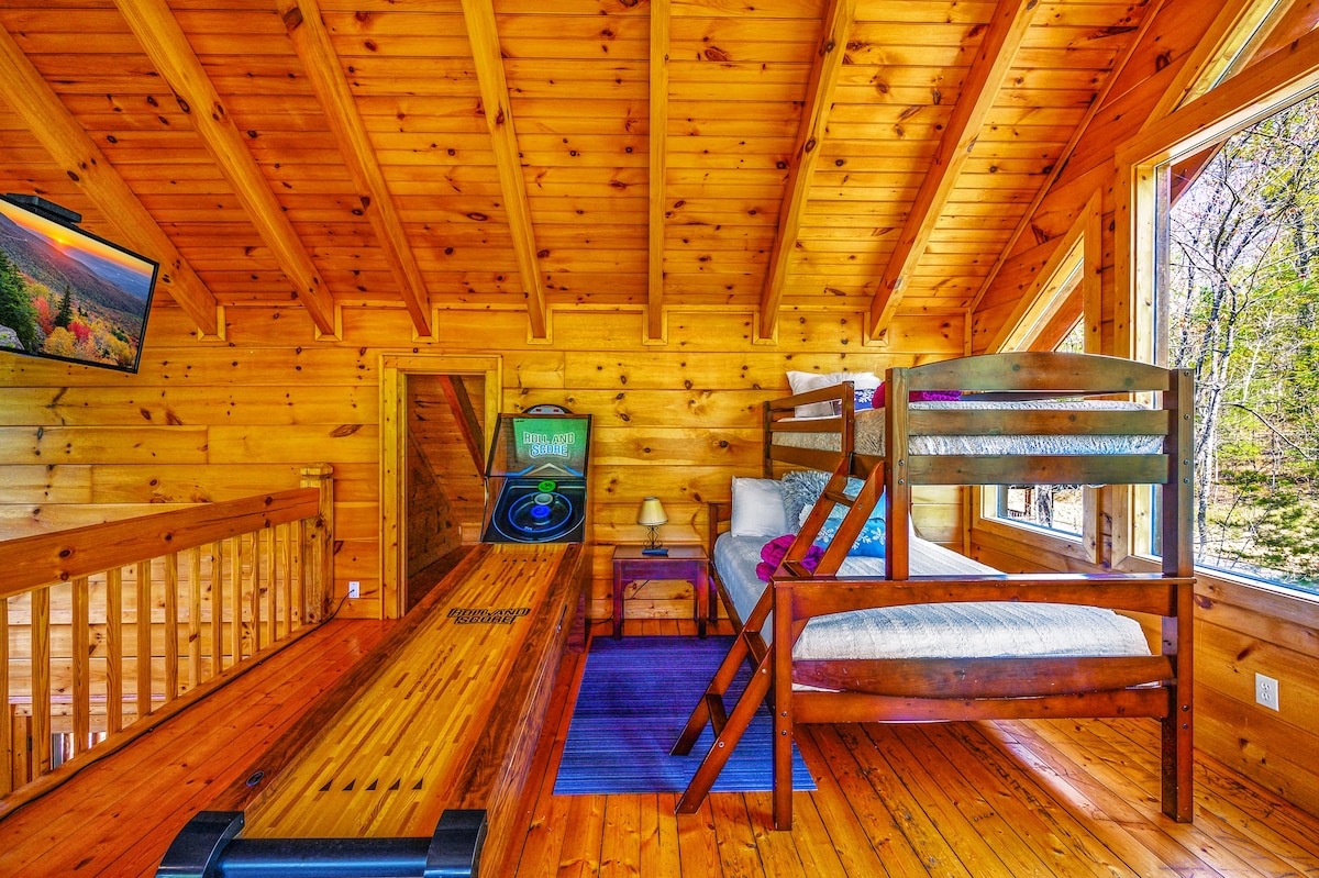 The jewel of the house is the upstairs loft room. Kids will adore exploring this space as it doubles up as a games room, complete with a pool table and skeeball. There’s lots of sleeping space in this roomy part of the house, with a twin-over-full bunk bed and a sleeper sofa. The only question is, “who gets the top bunk?!”