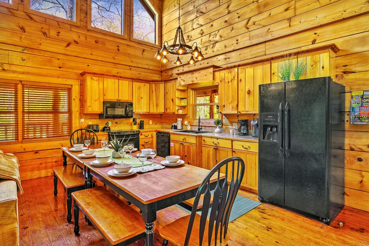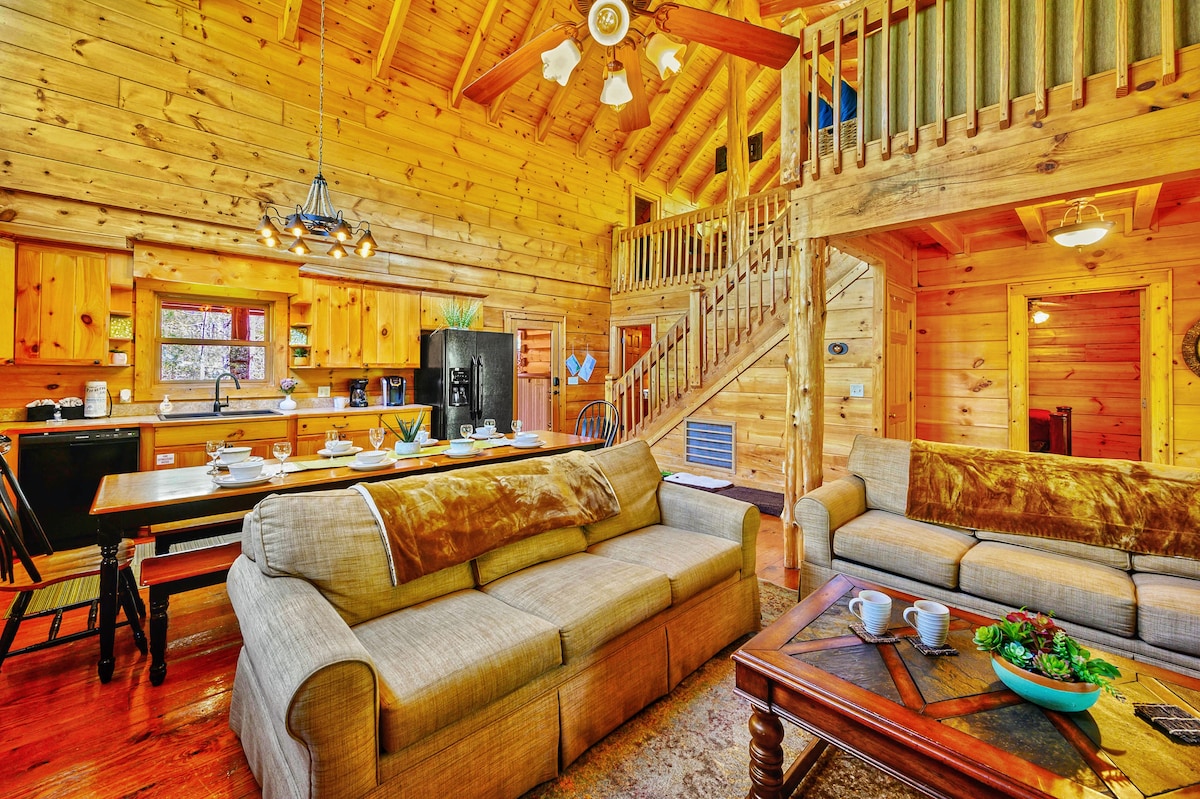 The modern, open-concept kitchen, dining, and lounge area in this private cabin is the perfect space for your family to relax and spend precious time together.